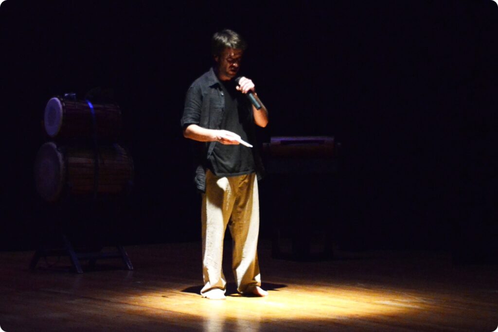Conteur et comédien, je raconte l’histoire et interprète les différents personnages qui la parcourent. Ce mariage du conte et du théâtre entretient le rythme ; le plaisir du spectacle est ainsi renouvelé d’un bout à l’autre des séances, quel que soit le public.